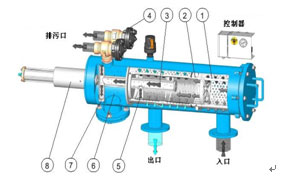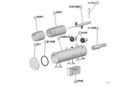 水力驅(qū)動(dòng)自清洗過濾器由主管組件、端蓋組件、細(xì)濾芯組件、粗濾芯組件、吸污器組件、水力馬達(dá)、水力缸組件、排污閥、管路控制系統(tǒng)等主要零部件組成。水由入水 口進(jìn)入過濾器,首先經(jīng)過粗濾芯組件濾掉圈套顆粒的雜質(zhì),然后到達(dá)細(xì)濾網(wǎng),通過細(xì)濾網(wǎng)濾除細(xì)小顆粒的雜質(zhì)后,清水由出水口排出。